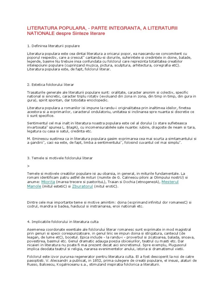 Literatura populara este o parte semnificativa a folclorului romanesc, care inseamna totalitatea productiilor intelepciunii unui popor (artistice, literare, muzicale, plastice, coregrafice, dramatice), create si transmise prin cuvant si practici de catre popor.. Literatura populara este o parte semnificativa a folclorului romanesc, care inseamna totalitatea productiilor intelepciunii unui popor (artistice, literare, muzicale, plastice, coregrafice, dramatice), create si transmise prin cuvant si practici de catre popor. Folclorul face parte integrata din cultura nationala si defineste spiritul unui popor. Literatura populară cuprinde opere literare care au caracter: Folclorul face parte integranta din cultura nationala si defineste spiritul unui popor.. Literatura populară este o parte semnificativă a folclorului romanesc, care înseamnă totalitatea producțiilor înțelepciunii unui popor (artistice, literare, muzicale,plastice, coregrafice, dramatice) create şi transmise prin cuvânt şi practici de către popor particularităţi: