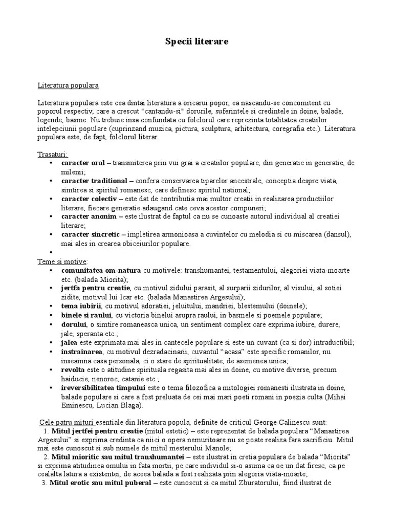 Literatura populară este o parte semnificativă a folclorului romanesc, care înseamnă totalitatea producțiilor înțelepciunii unui popor (artistice, literare, muzicale,plastice, coregrafice, dramatice) create şi transmise prin cuvânt şi practici de către popor particularităţi:.. Literatura populară cuprinde opere literare care au caracter: Folclorul face parte integranta din cultura nationala si defineste spiritul unui popor. Caracterul oral reprezinta trasatura specifica fundamentala a literaturii populare si consta in faptul ca aceasta este creata, pastrata prin viu grai, de la o generatie la alta, de catre rapsozi. Folclorul face parte integrata din cultura nationala si defineste spiritul unui popor. Caracterul oral reprezinta trasatura specifica fundamentala a literaturii populare si consta in faptul ca aceasta este creata, pastrata prin viu grai, de la o generatie la alta, de catre rapsozi.