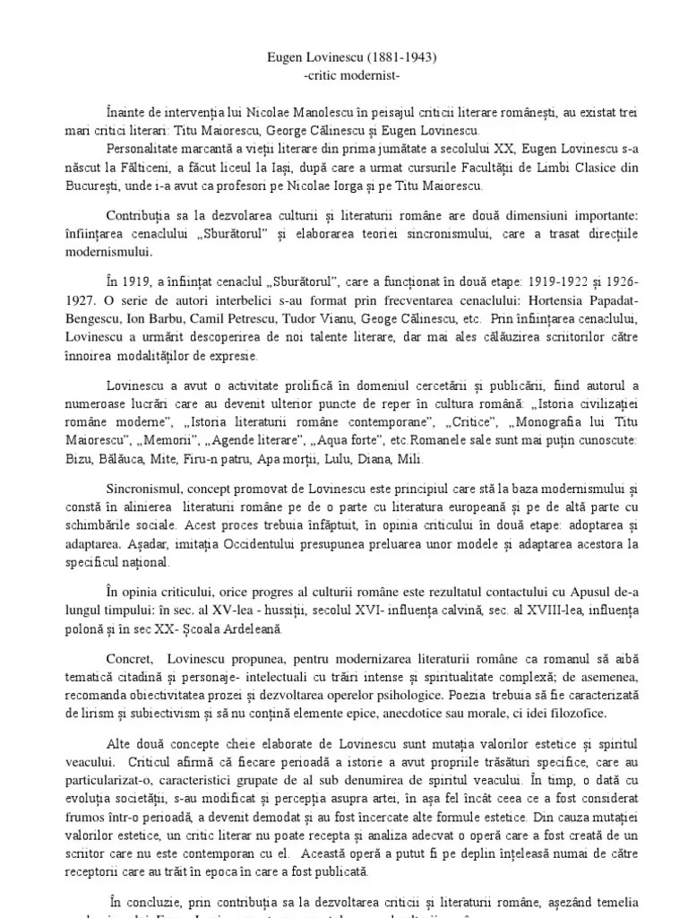 In istoria literaturii române moderne, eugen lovinescu acordă un capitol întreg prozatorului liviu rebreanu, considerat creatorul romanului românesc modern în literatura română datorită apariţiei primului roman obiectiv (ion) şi a primului roman de analiză psihologică (pădurea spânzuraţilor). Eugen lovinescu istoria literaturii române contemporane prefaţă în această lucrare nu bat drumuri noi, ci mă întorc pe un drum bătut de mult, a cărui concluzie a fost o istorie similară, concepută în şase mari volume, apărută în cinci, şi oprită In istoria literaturii române moderne, eugen lovinescu acordă un capitol întreg prozatorului liviu rebreanu, considerat creatorul romanului românesc modern în literatura română datorită apariţiei primului roman obiectiv (ion) şi a primului roman de analiză psihologică (pădurea spânzuraţilor). Livrare rapidă, cărți atent verificate și pregătite pentru vânzare. Ediţie şi postfaţă de eugen simion. Teoriile sincronismului şi a diferenţierii se opun, aşadar, opticii maioresciene, ce combătea formele fără fond, lovinescu fiind convins că numai preluarea acestora creează premisele apariţiei fondului. Teoriile sincronismului şi a diferenţierii se opun, aşadar, opticii maioresciene, ce combătea formele fără fond, lovinescu fiind convins că numai preluarea acestora creează premisele apariţiei fondului.