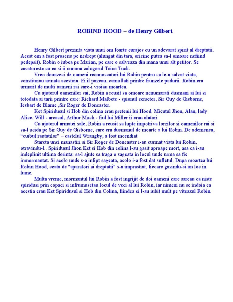1 vezi răspunsul publicitate publicitate ioanastefi2000 ioanastefi2000 in acest roman este vorba despre viata unui om foarte curaj si cu simtul dreptatii.robin este proscris pe nedrept si vanat e toti oamenii.robin are o iubie pe care o salveaza se casatoreste cu ea cu. Robin hood este editura penguin random house children's. In acest roman, henry gilbert prezinta viata unui om foarte curajos si care are un adevarat spirit al dreptatii.