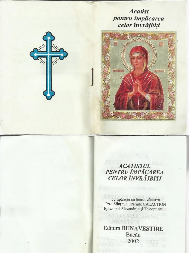 Ca a ta este împărăţia şi puterea şi slava, acum si pururea şi în vecii vecilor. Acatistul maicii domnului pentru împăcarea celor învrăjbiţi. Acatistul împăcării şi iertării celor învrăjbiţi alcătuit cu osteneala ierom. Ghelasie gheorghe şi a fratelui vasile dragoş pâslaru (actualmente valerian monahul, n.n.), sfânta mănăstire frăsinei, 2001. Ghelasie gheorghe şi a fratelui vasile dragoş pâslaru (actualmente valerian monahul, n.n.), sfânta mănăstire frăsinei, 2001. 593518 afisari | 30 septembrie 2009. Prin numele de acatist se înţelege "rugăciune citită în picioare", deci este o rugăciune care se citeşte obligatoriu în picioare sau stând în genunchi, dar numai după rostirea rugăciunilor începătoare! Editia integrala este astfel un ghid esential pentru oric 56.00 lei Dar cu rugăciunile prea curatei maicii tale şi ale sfinţilor, nădăjduim în milostivirea ta, să se mântuiască sufletele noastre. Ghelasie gheorghe şi a fratelui vasile dragoş pâslaru (actualmente valerian monahul, n.n.), sfânta mănăstire frăsinei, 2001.. Ghelasie gheorghe şi a fratelui vasile dragoş pâslaru (actualmente valerian monahul, n.n.), sfânta mănăstire frăsinei, 2001.