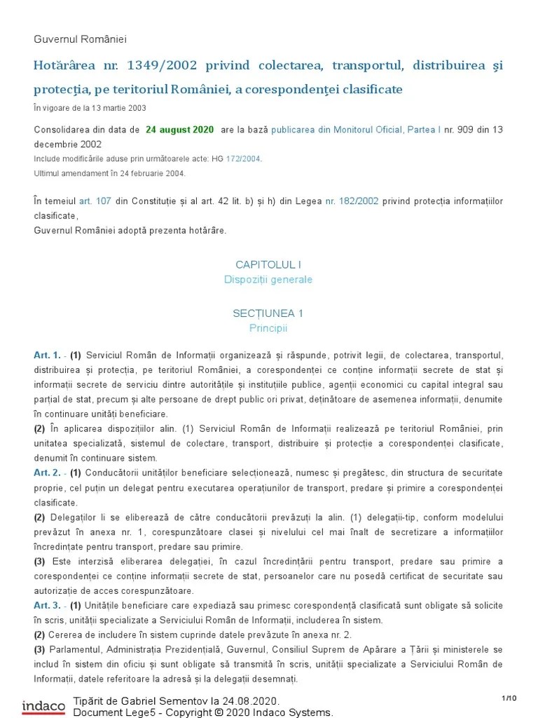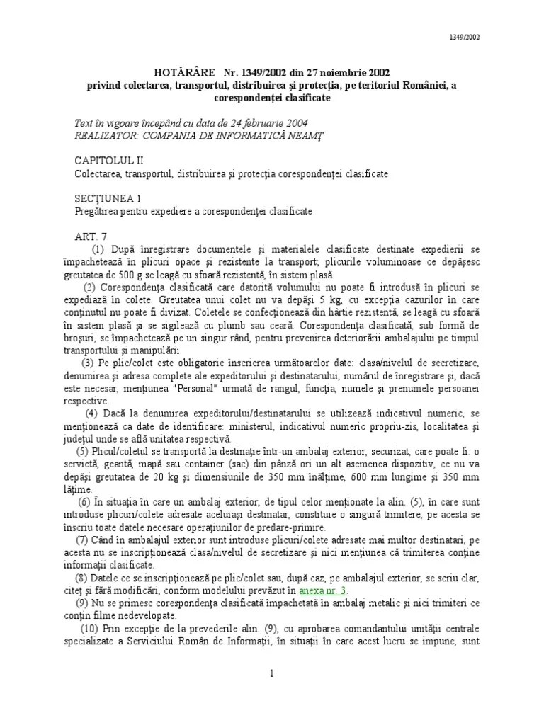 1.349 din 27 noiembrie 2002(*actualizată*) privind colectarea, transportul, distribuirea şi protecţia, pe teritoriul româniei, a corespondenţei clasificate (actualizată până la data de 24 februarie 2004*) emitent: B) din ordonanța de urgență a guvernului nr. 1 se aprobă normele privind protecţia informaţiilor clasificate ale organizaţiei tratatului 107 din constituţie şi al art. (1) din ordonanţa de urgenta a guvernului nr. 575 din 5 august 2002.